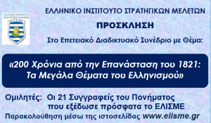 Το Ελληνικό Ινστιτούτο Στρατηγικών Μελετών, (ΕΛ.Ι.Σ.ΜΕ.), στο πλαίσιο συμμετοχής του στον Εορτασμό των 200 χρόνων από το 1821, ανακοινώνει την διοργάνωση Συνεδρίου, με θέμα «200 Χρόνια από την Επανάσταση του 1821: τα Μεγάλα Θέματα του Ελληνισμού». Η εκδήλωση πραγματοποιείται διαδικτυακά την 7η και 8η Οκτωβρίου 2021 και από ώρες 09.45-13.00 και 14.00-17.30, στο κτήριο της ΓΣΕΒΕΕ, Αριστοτέλους 46, Αθήνα.