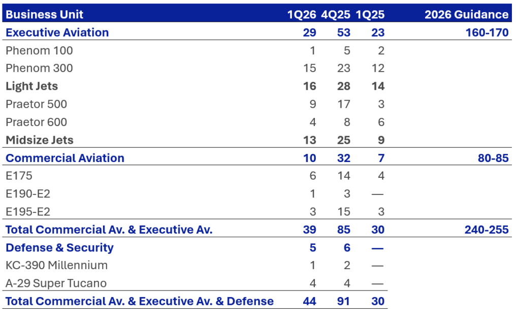Executive Aviation delivered 29 jets during the quarter, up 26% when compared to 1Q25, when 23 aircraft were delivered. Higher deliveries of both light and midsize jets propped the strong performance, and reflected continued solid demand across the segment.