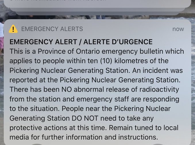 Καναδοί πολίτες σε όλη την επαρχία του Οντάριο, που έχει πληθυσμό 14,5 εκατομμύρια ανθρώπους, έλαβαν νωρίς το πρωί της Κυριακής επείγον μήνυμα τύπου Alert για “πυρηνικό επεισόδιο” στην πόλη του Pickering, 30 λεπτά μακρυά από το Τορόντο.