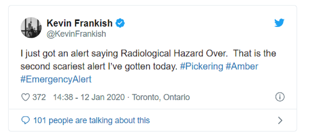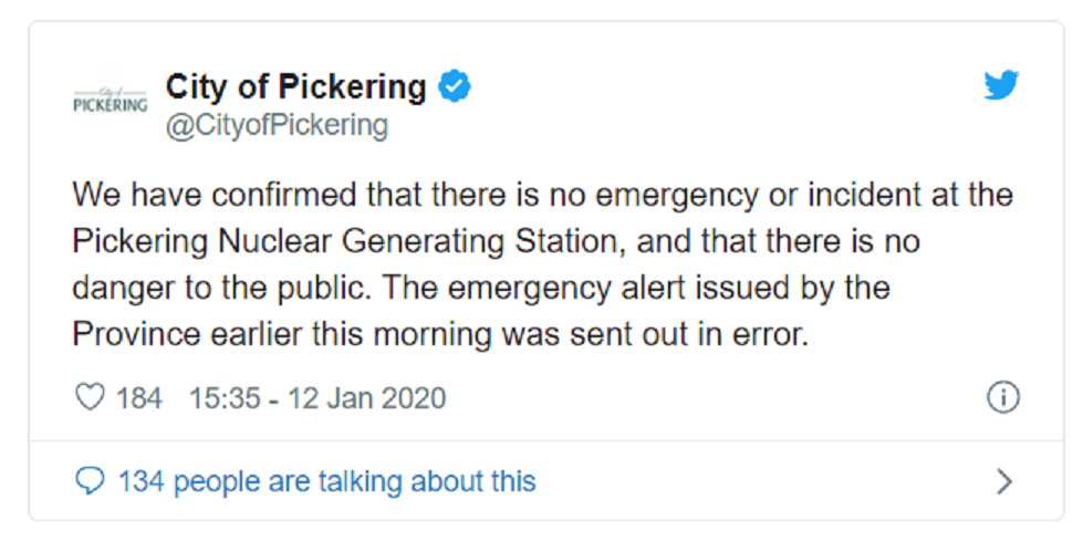 Το μήνυμα απευθυνόταν σε ανθρώπους που ζουν σε ακτίνα 10 χιλιομέτρων από τον πυρηνικό σταθμό του Pickering και προκάλεσε πανικό παρά το ότι συνοδευόταν από τη φράση “ΚΑΜΙΑ ανωμαλία δεν παρατηρείται στο επίπεδο ραδιενέργειας γύρω τον σταθμό”. Η κατάσταση ομαλοποιήθηκε πάνω από μια ώρα αργότερα με δεύτερο μήνυμα που αποκάλυπτε πως το πρώτο μήνυμα ήταν λάθος.