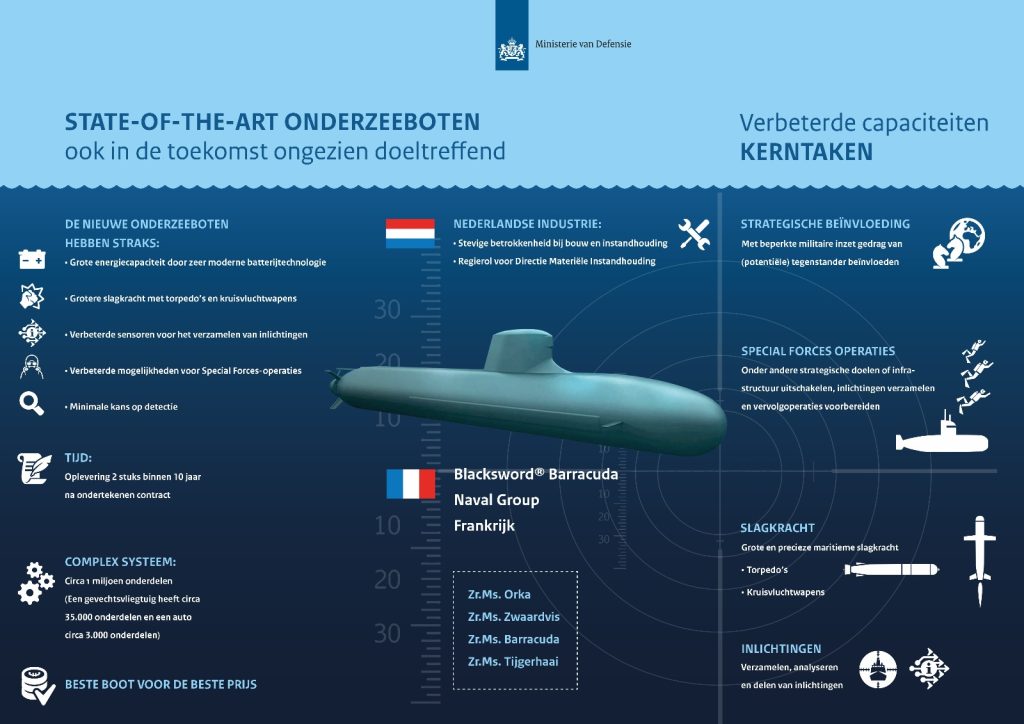 Όπως είχε ήδη διαρρεύσει σε πολλά ξένα ΜΜΕ, ανακοινώθηκε σήμερα και επίσημα πως η Naval Group επικράτησε στον ολλανδικό διαγωνισμό υποβρυχίων, έναντι μιας κοινοπραξίας Saab-Damen όπως και της γερμανικής TKMS, προτείνοντας μια έκδοση συμβατικής πρόωσης του υποβρυχίου Barracuda, με την επωνυμία Blacksword.