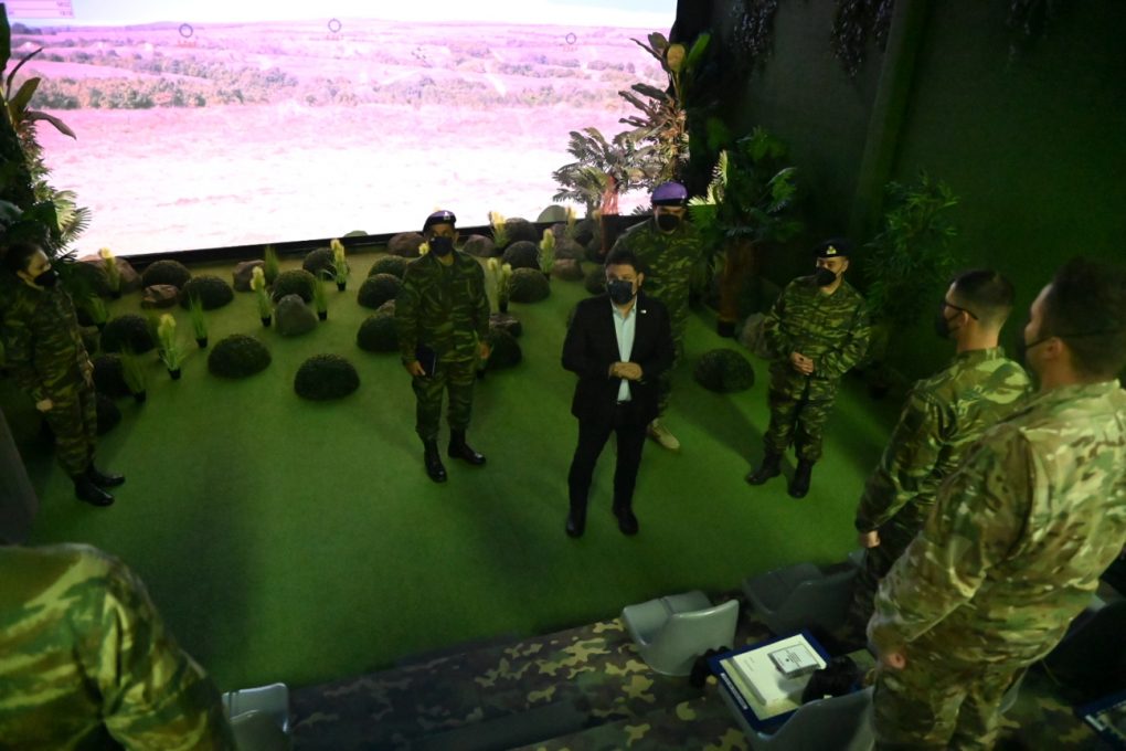 Στο πλαίσιο της επίσκεψης ο ΥΦΕΘΑ παρακολούθησε επίδειξη οπλικών συστημάτων και εκτέλεση εικονικών βολών στην αίθουσα του Ηλεκτρονικού Πεδίου Βολής με την εφαρμογή «ΚΕΡΑΥΝΟΣ», όπου οι εκπαιδευόμενοι έχουν τη δυνατότητα να εξοικειωθούν και να εφαρμόσουν τις διαδικασίες που ακολουθούνται στο Πυροβολικό. Επίσης, ενημερώθηκε για το Σύστημα Τεχνικού και Τακτικού Ελέγχου Πυρός «ΔΙΑΣ», όπου οι εκπαιδευόμενοι Πυροβολητές εφαρμόζουν τις δυνατότητες των νέων τεχνολογιών στα υλικά, τα μέσα και τις διαδικασίες για το Πυροβολικό Μάχης.