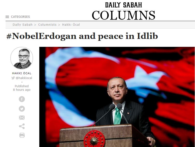 “Οι προσπάθειες του Προέδρου Ερντογάν να εξασφαλίσει ειρήνη για το μέλλον της Ιντλίμπ αρκεί για να είναι υποψήφιος για το Νόμπελ Ειρήνης”. Αυτό υποστηρίζει ο Hakki Ocal, μέσω άρθρο του στην Daily Sabah.