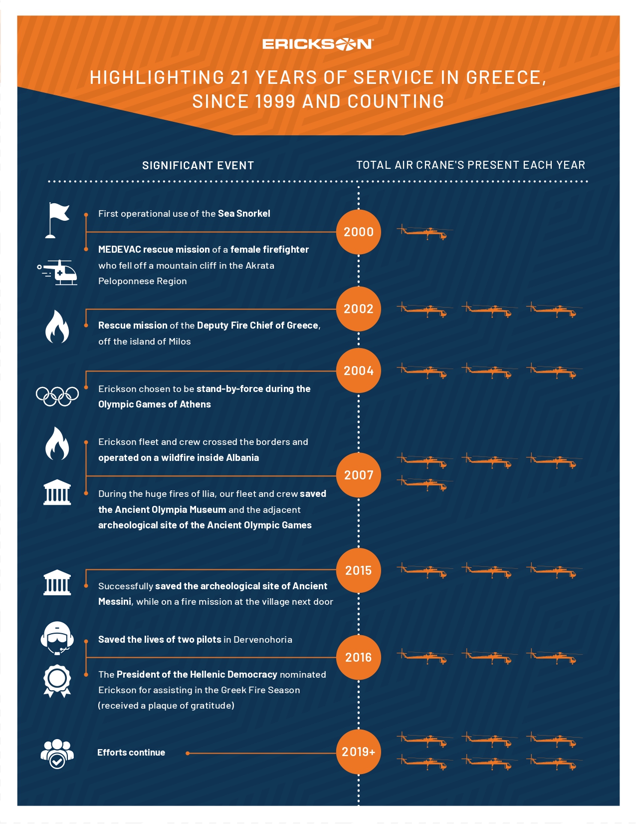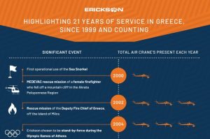 Η παρουσία των ελικοπτέρων της Erickson έχει συνδεθεί με όλες τις μεγάλες φωτιές στην Ελλάδα. Είναι όμως χιλιάδες οι φορές, που η παρουσία τους απέτρεψε μεγαλύτερες καταστροφές. Η παρουσία της Erickson στην Ελλάδα, συνοψίζεται στο παρακάτω infogpraphic.