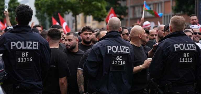 Η αστυνομία του Βερολίνου παρενέβη νωρίτερα απόψε προκειμένου να διαλύσει στο Βερολίνο πορεία Τούρκων φιλάθλων, οι οποίοι χρησιμοποιούσαν τον χαρακτηριστικό χαιρετισμό των «Γκρίζων Λύκων».