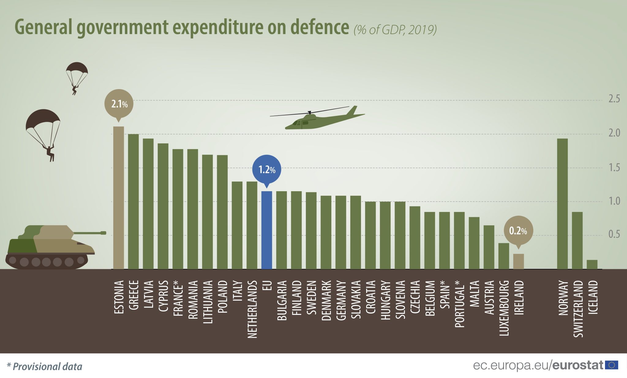 Σήμερα (27/8) η Eurostat δημοσίευσε ένα επεξηγηματικό γράφημα, όπου αναφέρει τις αμυντικές δαπάνες, ως προς το ποσοστό του ΑΕΠ, μεταξύ των κρατών-μελών της Ευρωπαϊκής Ένωσης (στοιχεία 2019).