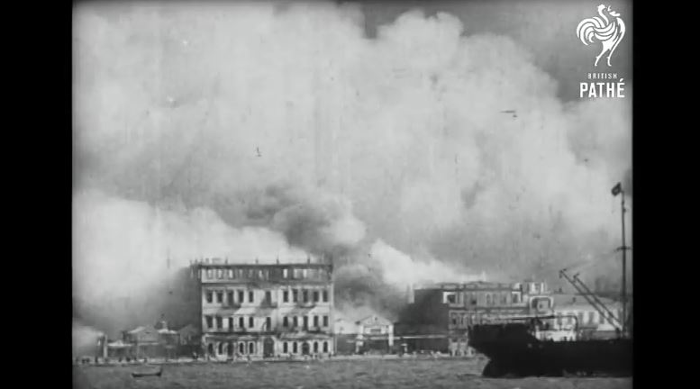 According to Giles Milton (based on eyewitness accounts and the memories of survivors, many interviewed for the first time), turkish soldiers were seen dousing buildings with petroleum. Soon, all but the Turkish quarter of the city was in flames and hundreds of thousands of refugees crowded the waterfront, desperate to escape. The city burned for four days; by the time the embers cooled, more than 100,000 people had been killed and millions left homeless.