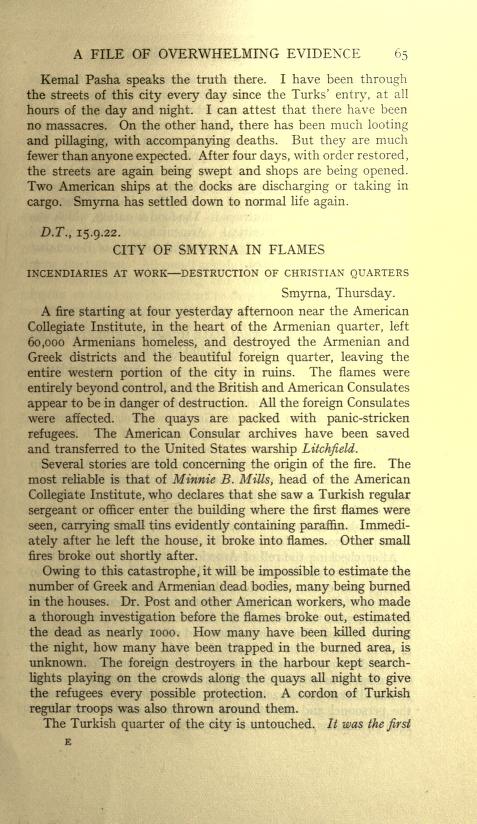 Sworn testimonies of the american staff of the Collegiate Institute, revealed that the fire was set by turkish regular soldiers. The most reliable is that of Minnie B. Mills, head of the American Collegiate Institute who declared that she saw a turkish army soldier enter the building where the first flames were seen carriyng small tins evidently containing paraffin. “I saw with my own eyes a Turkish officer enter the house with small tins of petroleum or benzine and in a few minutes the house was in flames.”