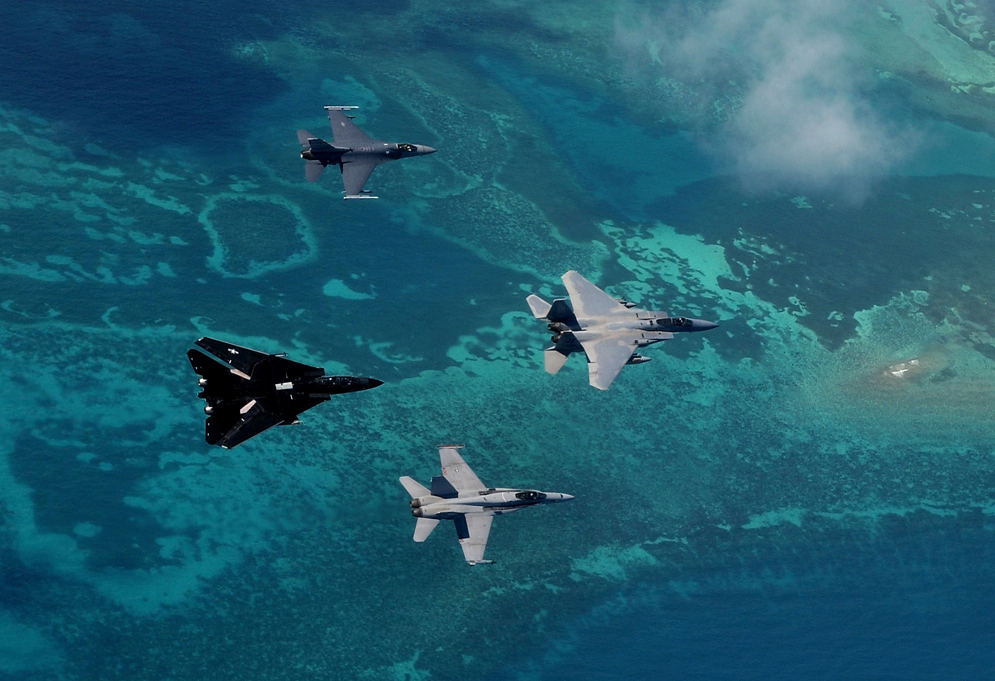 An Air Force F-15 and F-16 fly in formation with a Navy F-14 and F-18 Oct. 23, 2002 over East Coast waters during exercise Cope Snapper 02 at Key West Naval Air Station Key West Fla. Cope Snapper exercise 02 is a multi-aircarft exercise that engages dissimilar air combat training with on fighter data link and joint operations with the Navy. The members involved in Cope Snapper consist of the 159 Fighter Wing’s, Louisiana F-15 fighters, the 169 AGS McEntire Air National Guard’s, maintenance crew, S.C., F-16 fighter jets, and the Navy’s F-18s and F-14 fighter jets. (U.S. Air Force photo by Staff Sgt. Shane A. Cuomo) (RELEASED)