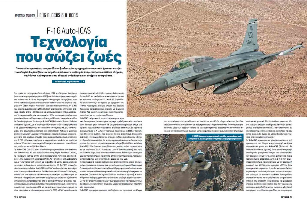 Πίσω από το προσκήνιο των μεγάλων εξοπλιστικών προγραμμάτων συνεχείς έρευνες σε νέες τεχνολογίες θωρακίζουν την ασφάλεια πτήσεων σε κρίσιμους τομείς όπως η απώλεια ελέγχου, ο κίνδυνος πρόσκρουσης στο εδαφικό ανάγλυφο και οι εναέριες συγκρούσεις. Σε φάση τελικής πιστοποίησης βρίσκεται ένα Αυτόματο Ολοκληρωμένο Σύστημα Αποφυγής Συγκρούσεων Auto-ICAS (Automatic Integrated Collision Avoidance System). Η «ολοκλήρωση» θα δημιουργήσει την πρώτη τέτοια υποδομή ασφάλειας πτήσεων για την αποφυγή τόσο εναέριων συγκρούσεων όσο και προσκρούσεων στο έδαφος, που αποτελούν σημαντικό μέρος των στρατιωτικών περιστατικών παγκοσμίως.