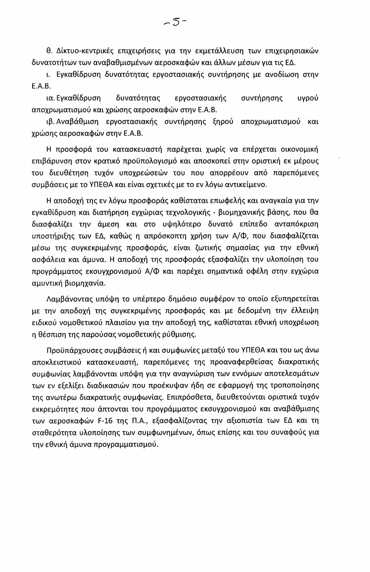 Σύμφωνα με σχετική τροπολογία που υπογράφθηκε πριν λίγες ημέρες από τον υπουργό Εθνικής Άμυνας κ. Πάνο Καμμένο και προσυπογράφθηκε από τον υπουργό Οικονομικών κ. Ευκλείδη Τσακαλώτο έγινε δεκτή προσφορά της αναδόχου εταιρείας Lockheed Martin σχετικά με την παροχή αντισταθμιστικών ωφελημάτων (ΑΩ) στα πλαίσια της συμφωνίας αναβάθμισης των αεροσκαφών F-16 της ΠΑ στο επίπεδο V.