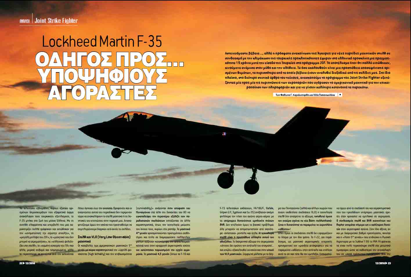 Αστειευόμαστε βέβαια…, αλλά η πρόσφατη ανακοίνωση της Άγκυρας για νέες παρτίδες μαχητικών στελθ σε συνδυασμό με την κλιμάκωση της τουρκικής προκλητικότητας έφεραν στο ελληνικό προσκήνιο μια πραγματικότητα 15 χρόνια μετά την είσοδο της Τουρκίας στο πρόγραμμα JSF. Οι Έλληνες ανακάλυψαν το F-35 και το γεγονός ότι σύντομα θα αποτελεί την αιχμή της τουρκικής επιθετικότητας. Βέβαια στη συνέχεια πολλά ειπώθηκαν, κινούμενα ανάμεσα στον μύθο και την αλήθεια (αλλά και πολλές ανοησίες που συνεχίζουν να αναμασώνται από διάφορες πλευρές). Το άρθρο μας είναι μια προσπάθεια αποσαφήνισης ορισμένων κρίσιμων θεμάτων που αφορούν το αμερικανικό μαχητικό 5ης γενιάς, που αν και πολλές φορές έχουν επιμέρους αναλυθεί από τις σελίδες μας, εντούτοις δεν έχουν πλήρως κατανοηθεί στο γενικότερο πλαίσιο που συνθέτουν. Φυσικά δεν δίνουμε… οδηγίες αγοράς του Lightning II αλλά όμως πάντα θέλουμε να δώσουμε τροφή για προβληματισμό. Στο τεύχος μας που κυκλοφορεί (Π&Δ Νο 367, Δεκέμβριος 2016)
