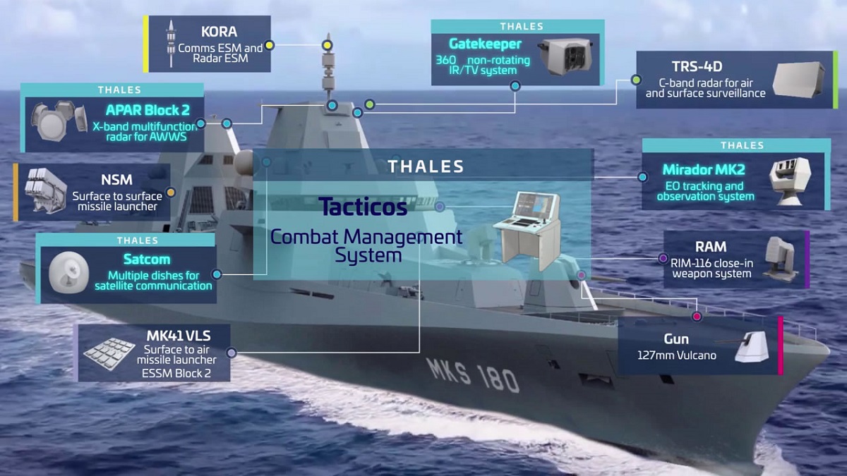 Το σύστημα αποστολής και μάχης του Thales περιλαμβάνει το ολοκληρωμένο σύστημα διαχείρισης μάχης Tacticos και το σύμπλεγμα ελέγχου πυρός AWWS. Η σύμβαση περιλαμβάνει τέσσερα συστήματα για τα υπό παραγγελία πλοία, υλικοτεχνικές υπηρεσίες και πολλαπλούς χώρους δοκιμών και εκπαίδευσης επί ξηράς, καθώς και δικαίωμα προαίρεσης για συστήματα για ένα ή δύο επιπλέον πλοία.