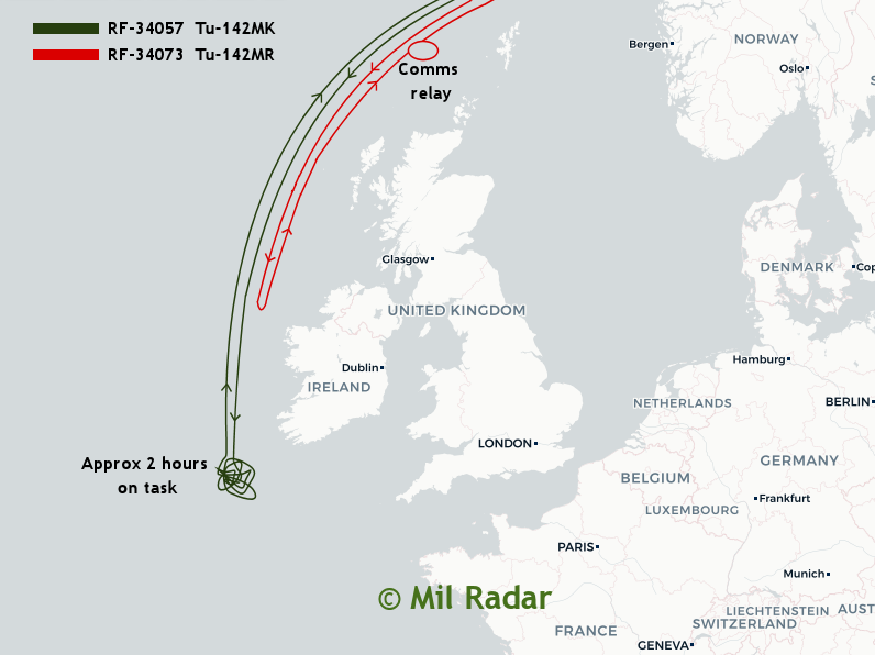 Το αναβαθμισμένο Tu-142MRM «Κόκκινο 17» (ΡΦ-34073) με το όνομα ‘Βελίκιι Ούστυουγκ’ και το ανθυποβρυχιακό Tu-142MK ‘Bear-F’ (ΡΦ-34057) ‘Βόλογκντα’ πέταξαν σε διεθνή εναέριο χώρο πάνω από την Θάλασσα Μπάρεντς, στον Αρκτικό ωκεανό, πριν συνεχίσουν νοτιότερα, πάνω από την Βόρεια Θάλασσα και τον Ατλαντικό, παίρνοντας καύσιμο κατά την διάρκεια της 13ωρης αποστολής τους από ιπτάμενο τάνκερ Il-78M (κωδ. ΝΑΤΟ, Midas). Το μακρύτερο σκέλος της πτήσης τους ήταν περίπου 10.000 χλμ, ανέφερε σχετική ανακοίνωση του ρωσικού υπουργείου Άμυνας.