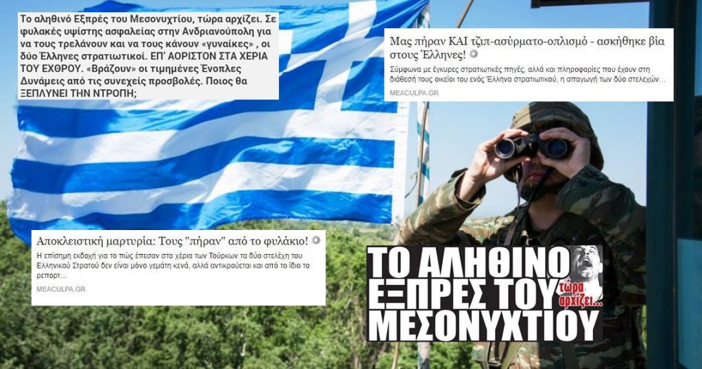 Από την προηγούμενη Παρασκευή που έγινε γνωστή η είδηση με τη σύλληψη των δύο στελεχών του Ελληνικού Στράτου από Τούρκους στον Έβρο, οι περισσότερες ενημερωτικές ιστοσελίδες, άρχισαν την αναπαραγωγή fake news και φημών χωρίς να διαθέτουν κανένα αξιόπιστο στοιχείο που να τους επιβεβαιώνει. Συγκεντρώσαμε τα μεγαλύτερα fake news (μέχρι στιγμής) και σας τα παρουσιάζουμε όλα σε ένα άρθρο.