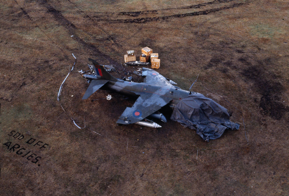 Από τα 10 Χάριερ GR.3 χάθηκαν τα 4: ‘Ενα χτυπήθηκε από βολές ελαφρών όπλων που του δημιούργησαν διαρροή καυσίμου με αποτέλεσμα να το εγκαταλείψει ο χειριστής του, ένα άλλο καταρρίφθηκε από αντιαεροπορικό πύραυλο Μπλόουπάιπ, ένα καταρρίφθηκε από βλήματα πυροβόλων Ερλικον 35 mm και το τελευταίο κατά τη διάρκεια προσγείωσης του στον πρόχειρο αεροδιάδρομο του Σαν Κάρλος που είχαν εγκαταστήσει οι Βρετανικές δυνάμεις, ξέφυγε από την πορεία του και του προξενήθηκαν σοβαρότατες ζημιές με αποτέλεσμα να μην ξαναπετάξει.