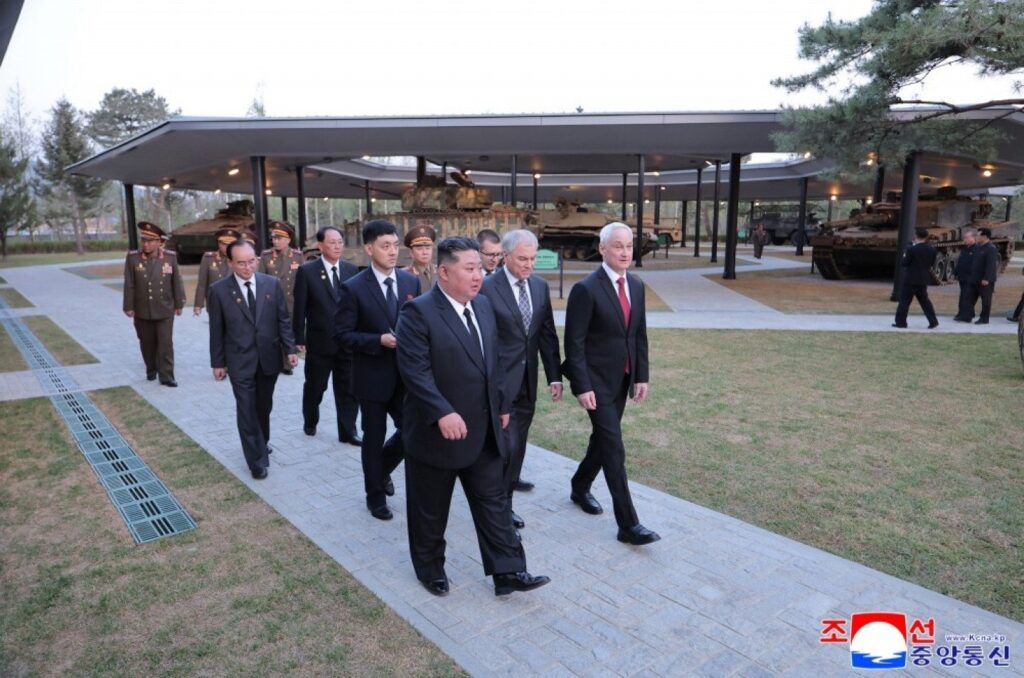 Στο ίδιο πλαίσιο εορτασμών και αποδόσεων τιμής (που συνεχίζονται εδώ και μήνες με μεγάλες τελετές έντονης συγκίνησης που μεταδίδονται από την κρατική τηλεόραση), η Βόρεια Κορέα παρουσίασε σε ειδική έκθεση λάφυρα δυτικών όπλων που υποστηρίζει ότι κατέλαβε στις μάχες κατά των Ουκρανών: Ανάμεσα τους άρματα Leopard 2A4 και Abrams M1A1, τεθωρακισμένα Marder, ένα τουρκικό Kipri, γαλλικά AMX-10RC και άλλο εξοπλισμό προέλευσης ΝΑΤΟ. Και εδώ, ο Κιμ και οι Ρώσοι αξιωματούχοι επιθεώρησαν τα εκθέματα, τα οποία χρησιμοποιούνται για να ενισχύσουν την εικόνα κοινών νικών κατά των δυτικών δυνάμεων.