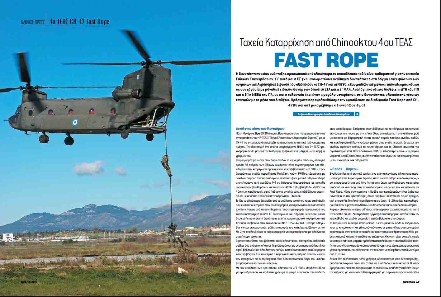 Η δυνατότητα ταχείας ανάπτυξης προσωπικού από ελικόπτερα σε οποιοδήποτε πεδίο είναι καθοριστική για την επιτυχία Ειδικών Επιχειρήσεων. Γι’ αυτό και ο ΕΣ έχει ενσωματώσει ανάλογες δυνατότητες στο Δόγμα επιχειρήσεων των ταγμάτων της Αεροπορίας Στρατού που αξιοποιούν τα CH-47 και τα NH90, εξασφαλίζοντας μέγιστη αποτελεσματικότητα σε συνεργασία με μονάδες ειδικών δυνάμεων όπως το ΕΤΑ και η Ζ΄ΜΑΚ. Ανάλογη ικανότητα διαθέτει η ΔΥΚ του ΠΝ και η 31η ΜΕΕΔ της ΠΑ, αν και η τελευταία έχει έναν «μεγάλο αστερίσκο» στις δυνατότητες υλοποίησης τέτοιων τεχνικών με τα μέσα που διαθέτει. Πρόσφατα παρακολουθήσαμε την εκπαίδευση σε διαδικασία Fast Rope από CH-47DG και σας μεταφέρουμε τις εντυπώσεις μας στο τεύχος που κυκλοφορεί (Π&Δ Νο 365, Οκτώβριος 2016).