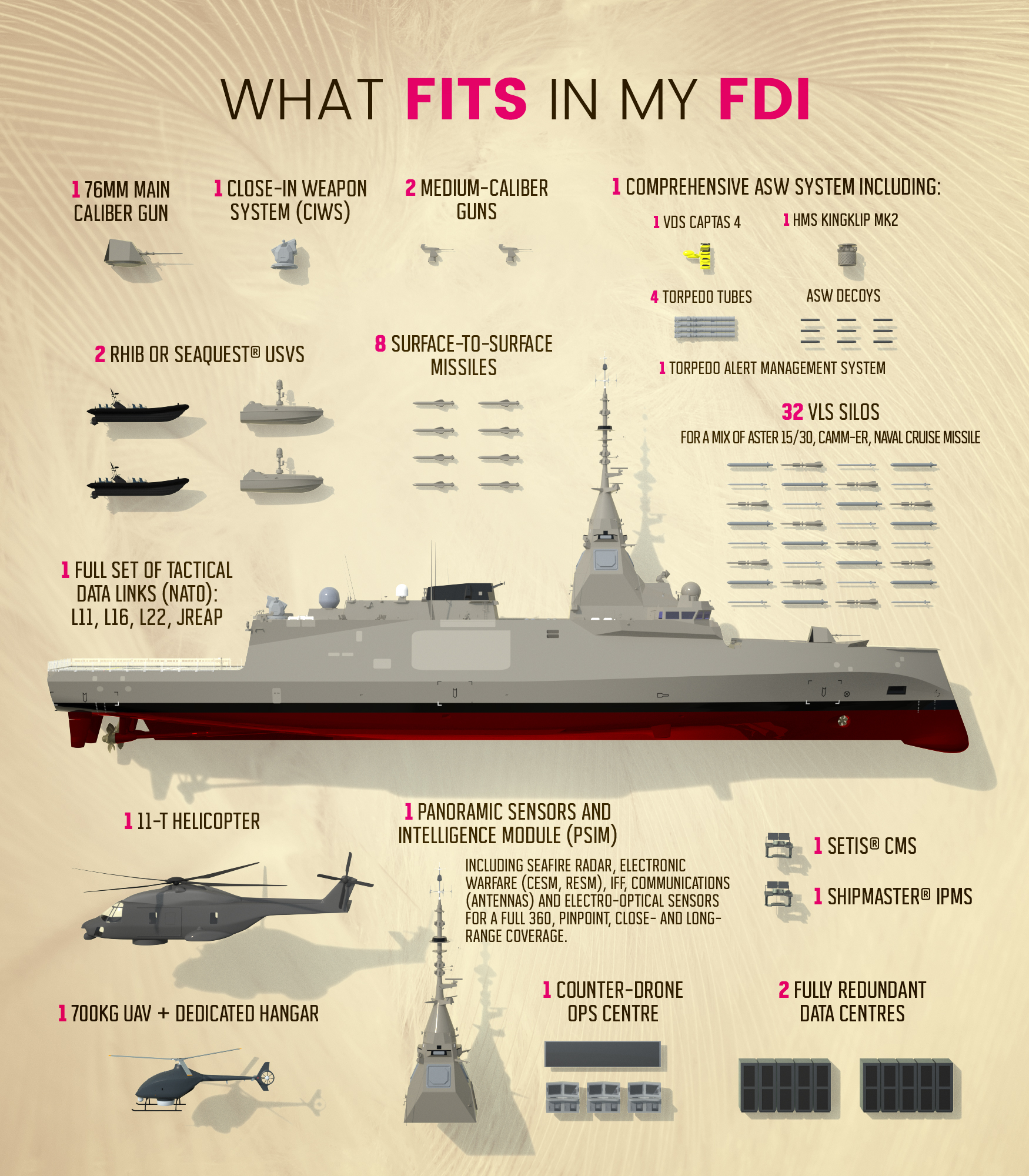 Οπότε η βασική διαμόρφωση του Γαλλικού Ναυτικού για τις FDI προβλέπει στο πρόστεγο δύο οκταπλούς εκτοξευτές Sylver A50 -συνολικά 16 κελιά για ισάριθμους Aster 15/30- και χώρο για ακόμη 2 A50 (όπως είναι η ελληνική διαμόρφωση). Αλλά εδώ, η προτεινόμενη λύση επιτρέπει την τοποθέτηση 24 πυραύλων CAMM σε κάθε μία από τις δύο εξτρά θέσεις. Αυτό σημαίνει ότι μια φρεγάτα FDI θα μπορεί να φέρει ταυτόχρονα 16 Aster και έως 48 CAMM, δηλαδή συνολικά 64 αντιαεροπορικούς πυραύλους.