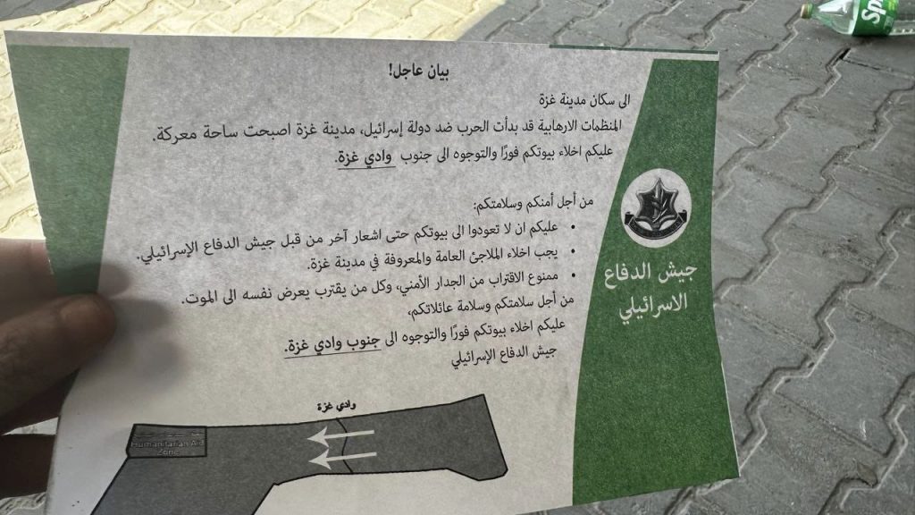 Οι τρομοκρατικές οργανώσεις ξεκίνησαν ένα πόλεμο κατά του κράτους του Ισραήλ και η πόλη της Γάζας έχει γίνει πεδίο μαχών. Πρέπει να εκκενώσετε το σπίτι σας αμέσως και να φύγετε νότια του Wadi Gaza (σ.σ. ένα μικρό ποτάμι περίπου στο μέσο της Λωρίδας, γνωστό ορόσημο). Για τη δική ασφάλεια και προστασία: Δεν πρέπει να επιστρέψετε στο σπίτι σας, μέχρι να υπάρξει σχετική ειδοποίηση από τις Ισραηλινές Ένοπλες Δυνάμεις. Δημόσιας χρήσης καταφύγια στην πόλη της Γάζας πρέπει να εκκενωθούν. Μην πλησιάζετε τον φράκτη για τη δική σας ασφάλεια και των οικογενειών σας. Όποιος τον προσεγγίζει μπορεί να πεθάνει. Πρέπει να εκκενώσετε το σπίτι σας και να πάτε νότια του Wadi.