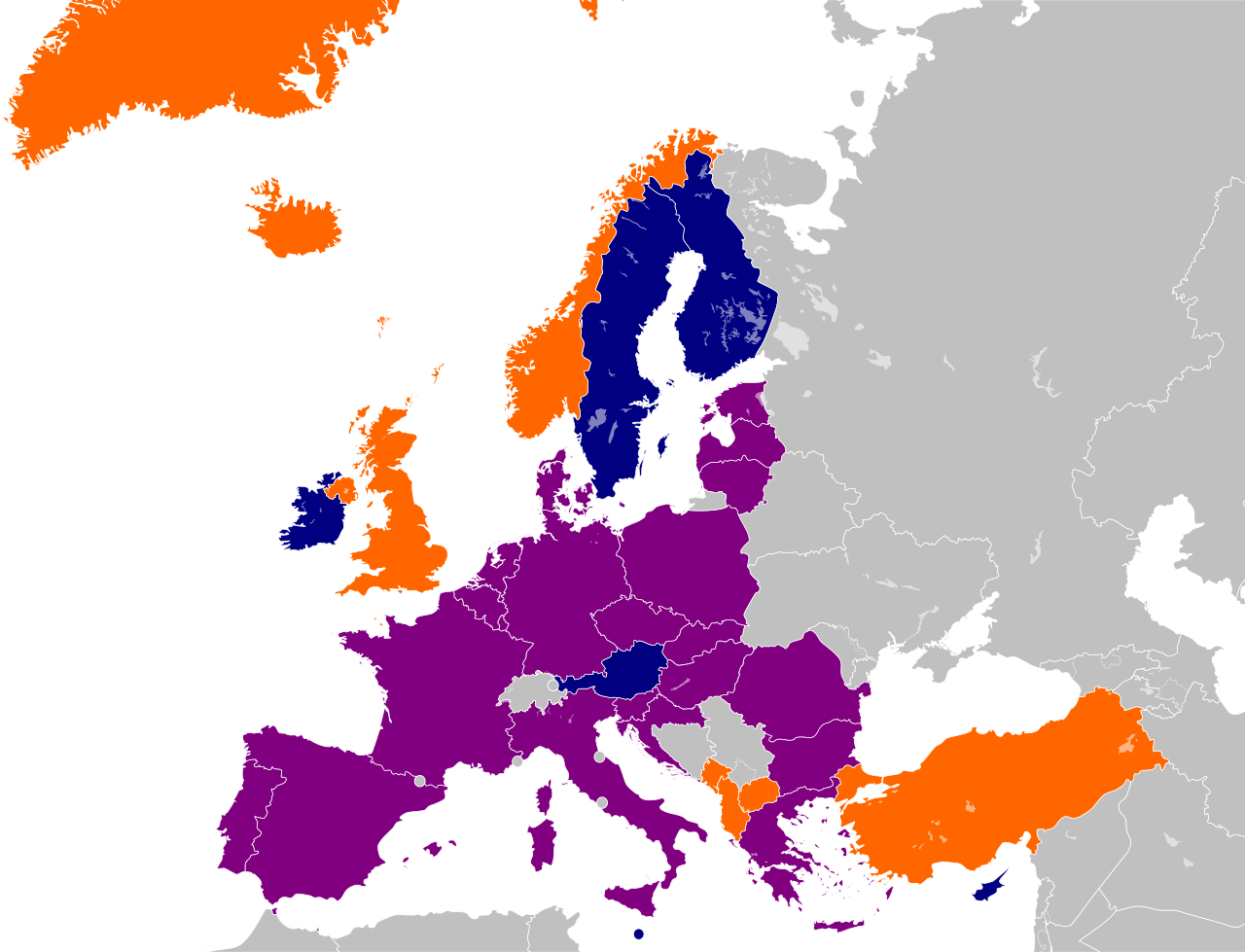 Στο χάρτη, με μπλε χρώμα στα βόρεια της Ευρώπης, η Σουηδία και η Φινλανδία. ΜΕ μωβ απεικονίζονται οι χώρες που είναι μέλη και σε ΝΑΤΟ και σε Ε.Ε., ενώ με πορτοκαλί οι χώρες που είναι μόνο μέλη ΝΑΤΟ. Αν Σουηδία και Φινλανδία μπουν στο ΝΑΤΟ, τότε η Ρωσία θα συνορεύει στα δυτικά της μόνο με την Ατλαντική Συμμαχία.