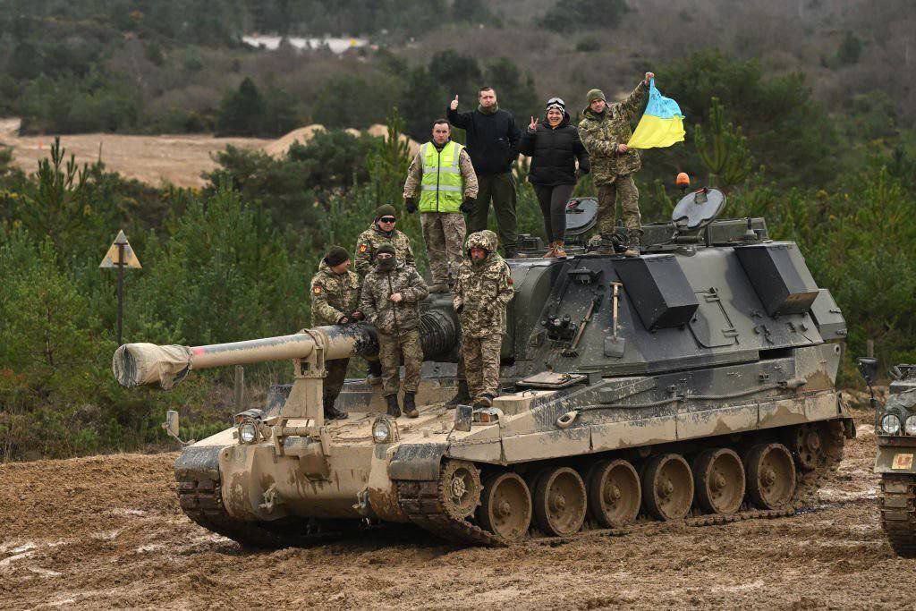 Ουκρανοί στρατιώτες πάνω σε ένα αυτοκινούμενο πυροβόλο AS90 SPH των βρετανικών ενόπλων δυνάμεων.