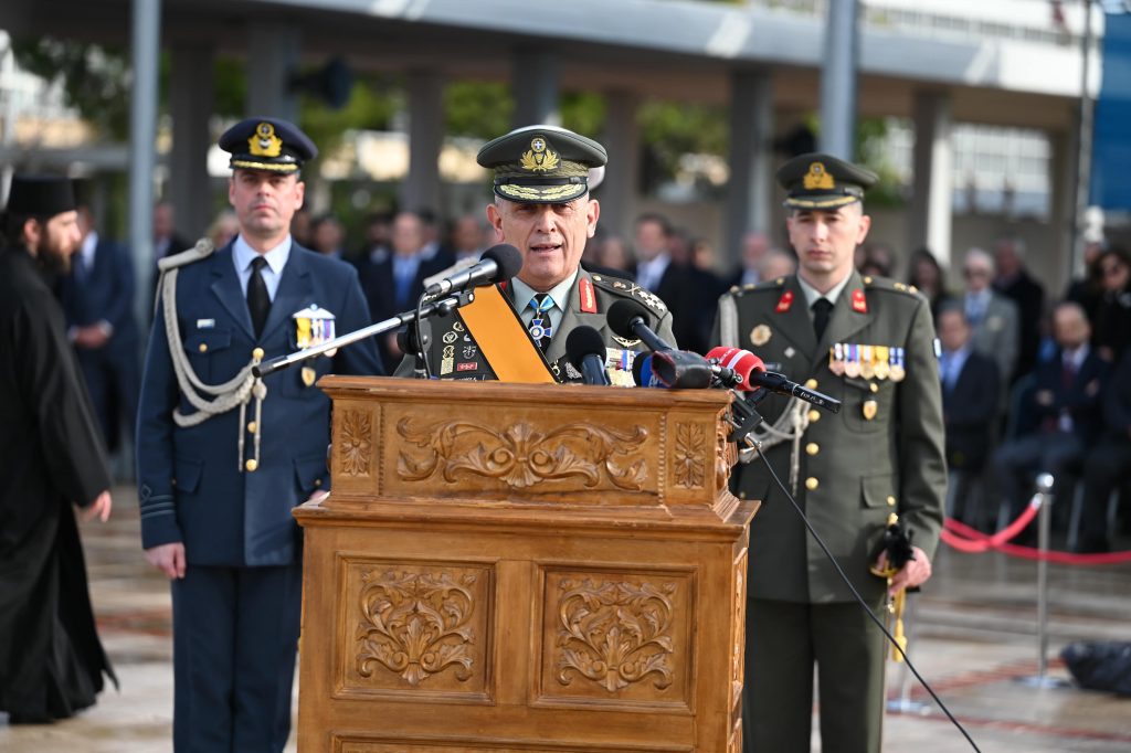Ούτε μια σπιθαμή γης λιγότερη, ούτε ένας κόκκος άμμου χαμένος! Κι αυτό χάρι σε όλους κι όλες, εσάς! Σας ευγνωμονώ! Συνεχίστε να κάνετε την Ελλάδα ισχυρή και σεβαστή από όλους! Και να θυμάστε πάντα τα λόγια του μεγάλου μας ποιητή, Διονυσίου Σολωμού, «Κλείσε μέσα στην ψυχή σου την Ελλάδα και θα αισθανθείς μέσα σου κάθε είδους μεγαλείο». Θα ήθελα επίσης να ευχαριστήσω ιδιαίτερα τους Διευθυντές των Κλάδων, των Ανεξαρτήτων Διευθύνσεων και γενικώς το Επιτελείο του ΓΕΕΘΑ, όλους αυτούς κι αυτές δηλαδή, που εργάσθηκαν όλα αυτά τα χρόνια άοκνα, μεθοδικά και αποτελεσματικά για να έχουμε αυτά τα πολλά και σημαντικά έργα και δράσεις των Ενόπλων Δυνάμεων, στις οποίες σταχυολογικά αναφέρθηκα πριν.