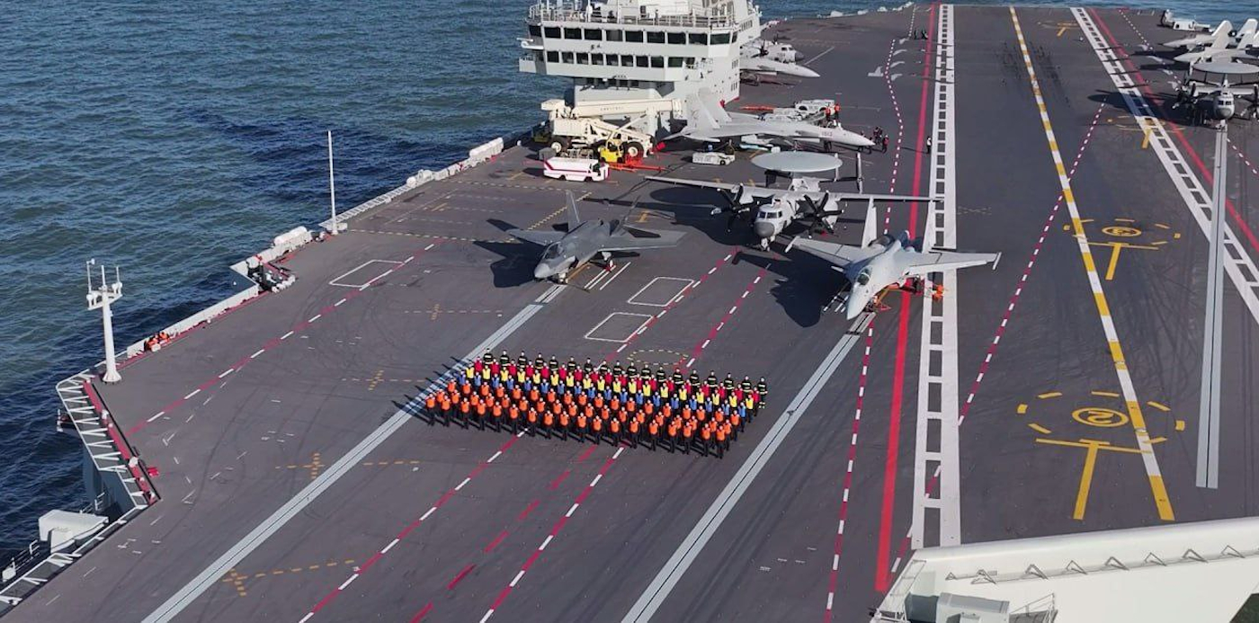 Παράταξη αεροσκαφών πάνω στο αεροπλανοφόρο Fujian «003». Προσέξτε τη νέα παραλλαγή του J-35A (κάτω από ρύγχος).