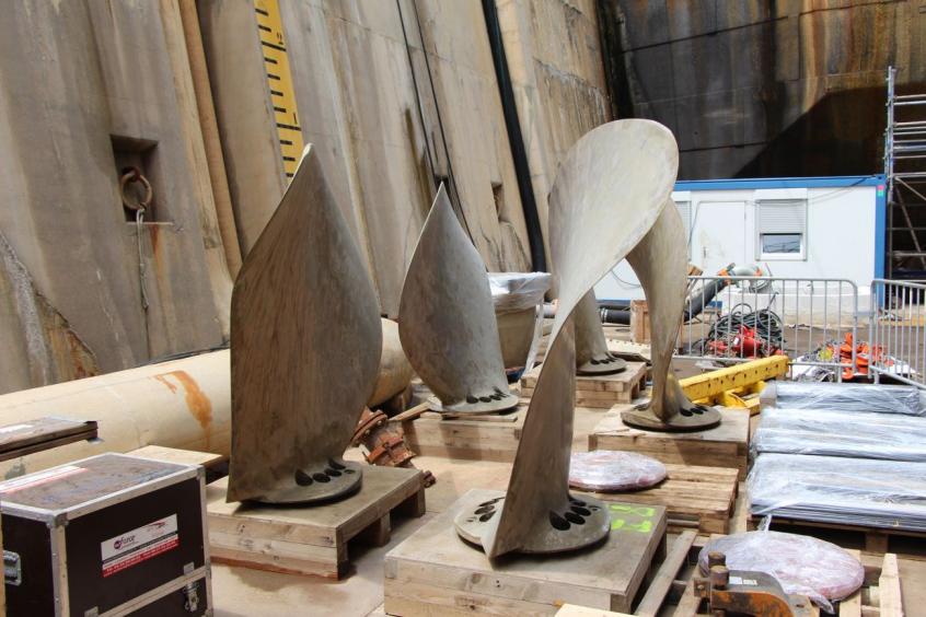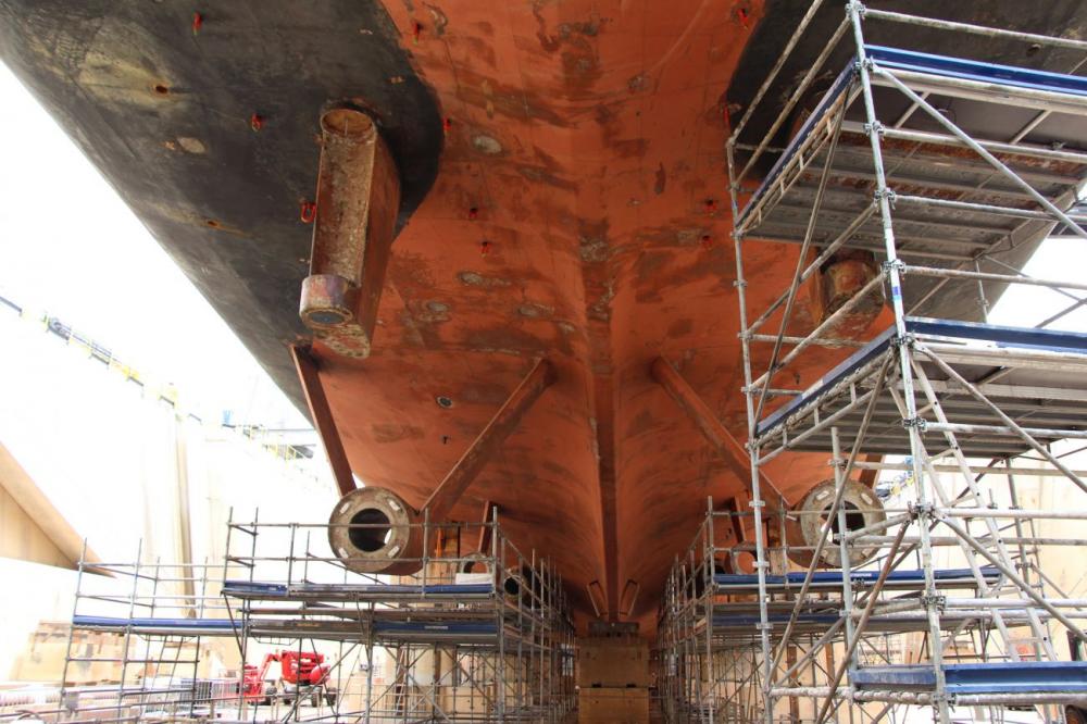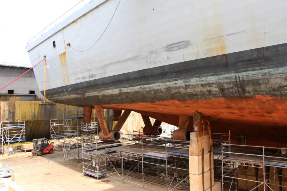Το εντυπωσιακό όμως είναι ότι μέρος των εργασιών επισκευής περιλαμβάνει και την πλήρη αφαίρεση των αξόνων μετάδοσης κίνησης στις προπέλες του σκάφους αλλά και τις ίδιες της προπέλες και τα πηδάλια διεύθυνσης, όπως εξάλλου είναι φανερό στις φωτογραφίες.