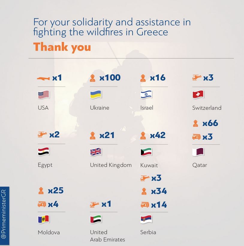Σε ανάρτηση στο λογαριασμό του πρωθυπουργού Κυριάκου Μητσοτάκη στο Twitter, αναφέρονται αναλυτικά οι χώρες που συνδράμουν την Ελλάδα στην κατάσβεση των πυρκαγιών και το είδος της βοήθειας που έχουν προσφέρει.