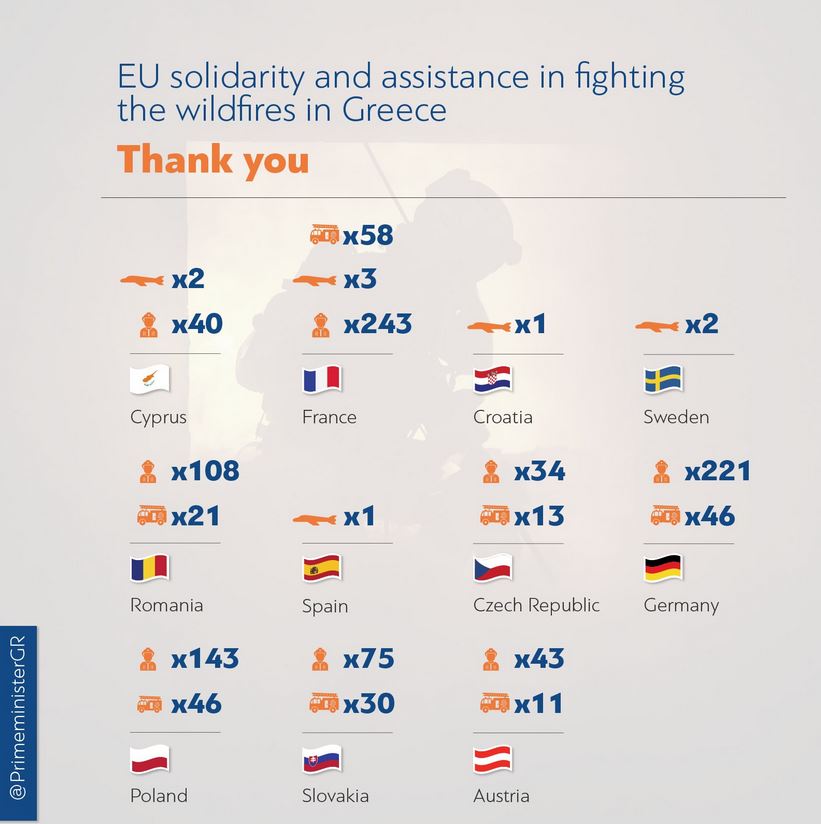 Σε ανάρτηση στο λογαριασμό του πρωθυπουργού Κυριάκου Μητσοτάκη στο Twitter, αναφέρονται αναλυτικά οι χώρες που συνδράμουν την Ελλάδα στην κατάσβεση των πυρκαγιών και το είδος της βοήθειας που έχουν προσφέρει.