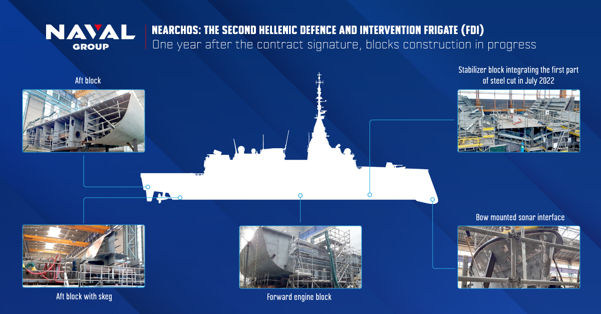Νέο φωτογραφικό υλικό από τις ελληνικές φρεγάτες FDI HN, δείχνει την πρώτη, την “Κίμων” να έχει ήδη βαφεί το κύτος της, ενώ έχει ξεκινήσει και η κατασκευή των μπλοκ της δεύτερης, της “Νέαρχος” για να συνεχίσει μετά η συναρμολόγηση της.
