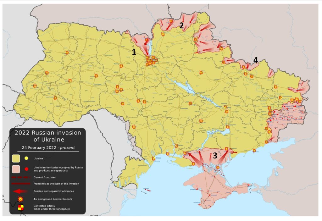 Τι βλέπουμε στην πράξη μέχρι τώρα: 4 κύριους επιθετικούς άξονες, όπου ο πρώτος, ο «Λευκορωσικός» όπως θα τον ονομάσουμε, έχει καταφέρει να περικυκλώσει το Κίεβο και να έχουμε ήδη αψιμαχίες μέσα στην πόλη. Στη συνέχεια έχουμε τον κυρίως «Βόρειο» άξονα (νο 2), αυτόν που έχει κάνει προωθήσεις σε ουκρανικό έδαφος κατά μήκος των βόρειων ουκρανικών-ρωσικών συνόρων, στοχεύοντας το Κονοτόπ και το Τσερνίγιβ (Τσέρνιγκοφ), τις εκεί δηλαδή μεγάλες πόλεις. Μετά ο 3ος σημαντικός άξονας είναι αυτός του «Νότου» που με εκκίνηση από την Κριμαία στρέφεται τόσο δυτικά προς Χερσώνα αλλά και ανατολικά προς Μελιτόπολη και μετά Μαριούπολη και συνδέεται ως τακτική με τον 4ο που στοχεύει το Χάρκοβο στο Βορρά, όπως θα αναλύσουμε στη συνέχεια.