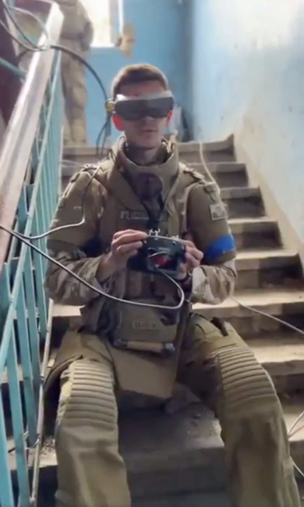 Το παρακάτω βίντεο απεικονίζει έναν Ουκρανό χειριστή FPV drone, εν ώρα επιχειρήσεων, εντός ενός κτιρίου. Φορώντας μια κάσκα εικονικής πραγματικότητας, ελέγχει το drone με ακρίβεια κάπου στο πεδίο της μάχης, και μετά γιορτάζει την όποια επιτυχία του.
