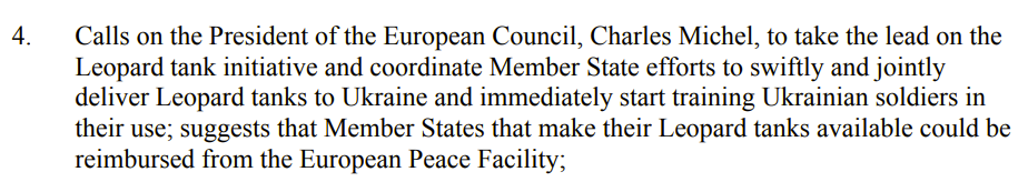 Η Ευρωπαϊκή Ένωση, πέρασε ένα (μη δεσμευτικό) ψήφισμα, που ζητά την παραχώρηση αρμάτων μάχης από τις χώρες-μέλη, στην Ουκρανία. Το ψήφισμα καταδικάζει τη ρωσική εισβολή και καλεί για την άμεση αποστολή αρμάτων και εκπαίδευση πληρωμάτων στην Ουκρανία.