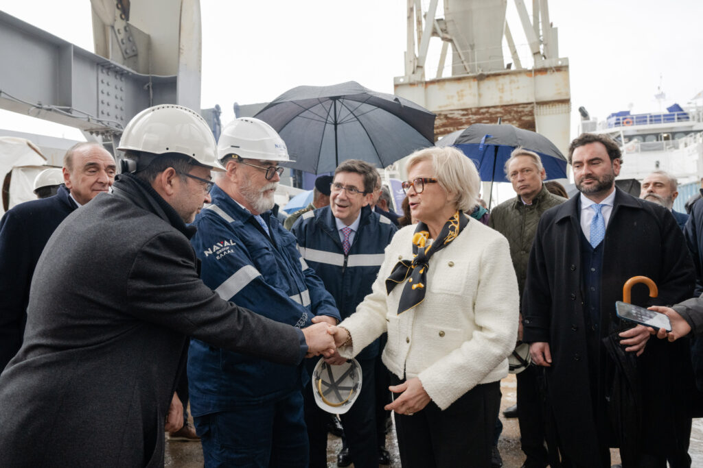 Στην φωτογραφία εμφανίζονται (από αριστερά προς δεξιά) οι: κ. Αντώνης Πέππας, CEO της ΕΤΜΕ, ο κ. Benoit Chapalain, CEO της Naval Group Hellas, ο κ. Pierre-Éric Pommelle, CEO της Naval Group, η κ. Catherine Vautrin, υπουργός Ενόπλων Δυνάμεων της Γαλλίας, ο κ. Γιώργος Κόρος, πρόεδρος Ναυπηγείων Σαλαμίνας