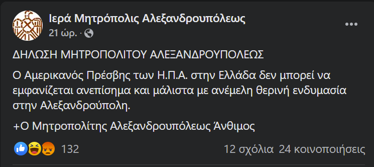 Η παραπάνω ανάρτηση, έγινε μέσω της “επίσημης” σελίδας της Μητροπόλεως Αλεξανδρουπόλεως στο Facebook. Αν και στο τέλος φέρει την υπογραφή του Σεβασμιότατου Άνθιμου, είναι περίεργο το γεγονός πως αυτή η προσωπική άποψη (σεβαστή αλλά όχι υπεράνω κριτικής), εκφράστηκε μέσω του λογαριασμού της Μητροπόλεως, που στο κάτω – κάτω, δεν την αφορά. Το χειρότερο είναι πως αυτή η ανάρτηση, χρησιμοποιήθηκε για να πλήξει την εικόνα των Ηνωμένων Πολιτειών στην Ελλάδα.