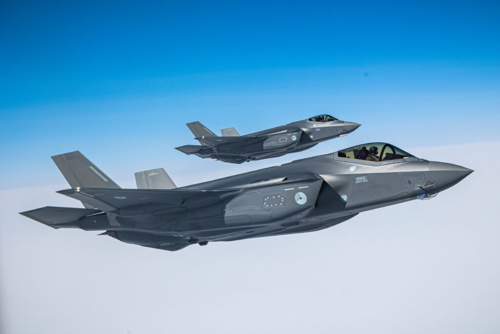 Two Dutch F-35 Lightnings patiently wait for their opportunity to maneuver into position to receive more fuel mid-air from a KC-135 Stratotanker over the Arctic Circle, May 31, 2023.