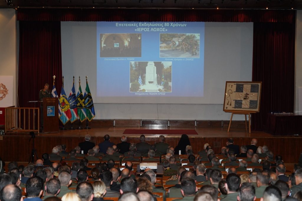 Στον χαιρετισμό του, ο αρχηγός ΓΕΕΘΑ αναφέρθηκε αρχικά στην προσωπικότητα του ιδρυτή του Ιερού Λόχου συνταγματάρχη Χριστόδουλου Τσιγάντε και έκανε μία σύντομη αναδρομή στην ιστορία του, από την ίδρυσή του τον Σεπτέμβριο του 1942 στη Μέση Ανατολή, την εκπαίδευσή του από Βρετανούς Καταδρομείς στο Κάιρο και στην Παλαιστίνη, την πρώτη του καταδρομική επιχείρηση τον Νοέμβριο του 1942 στη Βόρεια Αφρική, και το πλήθος των επιχειρήσεων στις οποίες συμμετείχε, μέχρι την καθοριστική συμβολή του στην απελευθέρωση των Δωδεκανήσων από τις δυνάμεις του Άξονα τον Μάιο του 1945, γράφοντας χρυσές σελίδες στην Ελληνική Στρατιωτική Ιστορία.
