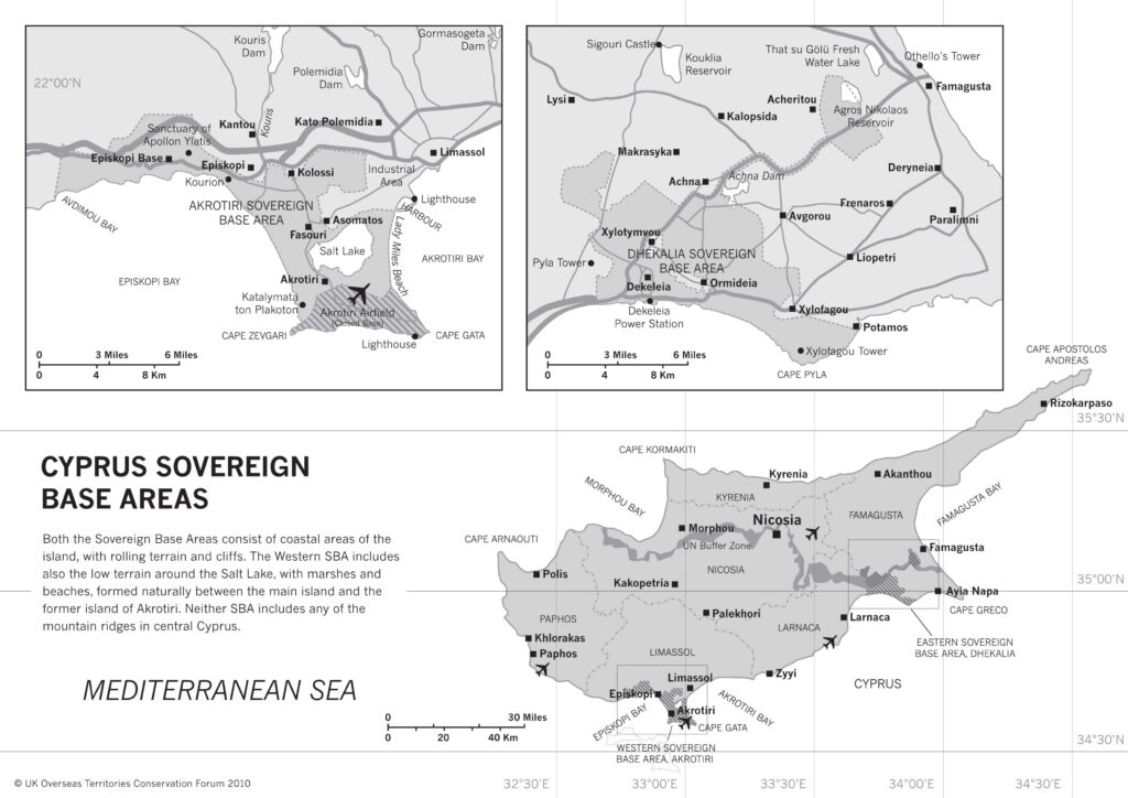 Αρχικά, όποιος το διατυπώνει αγνοεί την γεωγραφία της Κύπρου. Οι βρετανικές βάσεις είναι πράγματι έδαφος κυρίαρχο του Ηνωμένου Βασιλείου, όπως προέβλεψαν (δυστυχώς) οι συνθήκες Λονδίνου και Ζυρίχης του 1959 και 1960, με τις οποίες συνεστήθη και το ανεξάρτητο κυπριακό κράτος. Όμως στο έδαφος, εντός της περιμέτρου τους, σε Ακρωτήρι και Δεκέλεια, ζουν και εργάζονται πολλές χιλιάδες Κύπριοι. Έτσι η υποτιθέμενη “υπεράσπιση” των βάσεων, δεν αφορά το βρετανικό προσωπικό και τις εγκαταστάσεις αλλά και την πολυπληθή αυτή ελληνοκυπριακή κοινότητα.