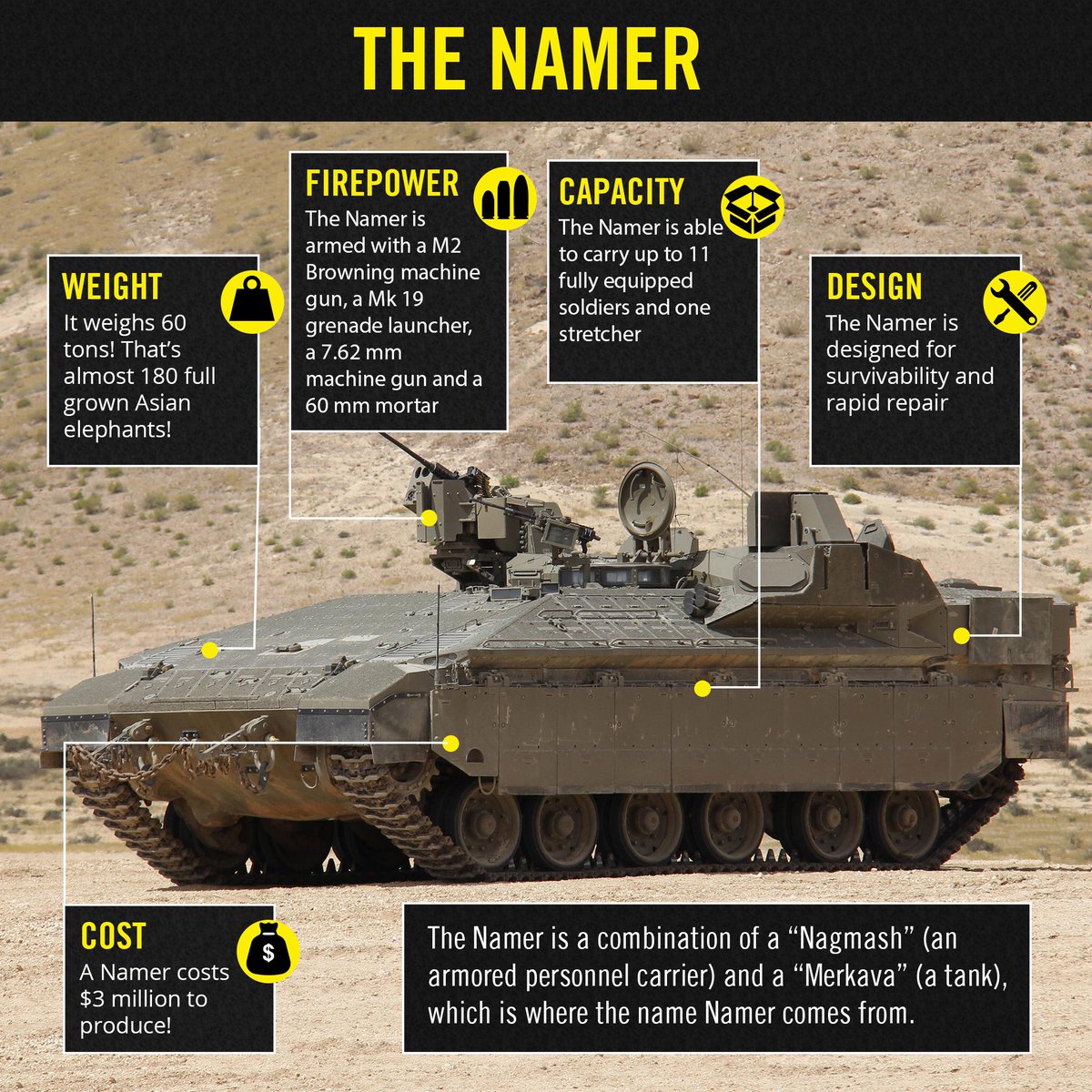 Με το όνομα να προέρχεται από το «Nagmash» (που σημαίνει στα εβραϊκά «ΤΟΜΠ») και «Merkava» («άρμα»), το Namer είναι ικανό να μεταφέρει έως 11 στρατιώτες με πλήρη φόρτο και ένα φορείο. Το όχημα ζυγίζει 60t, όσο 180 ενήλικες ασιατικοί ελέφαντες μαζί (μια αναλογία που πηγαίνει το νου στο πόσα κόκκινα διώροφα βρετανικά λεωφορεία χωρούν στο κατάστρωμα του «HMS Queen Elizabeth»…).