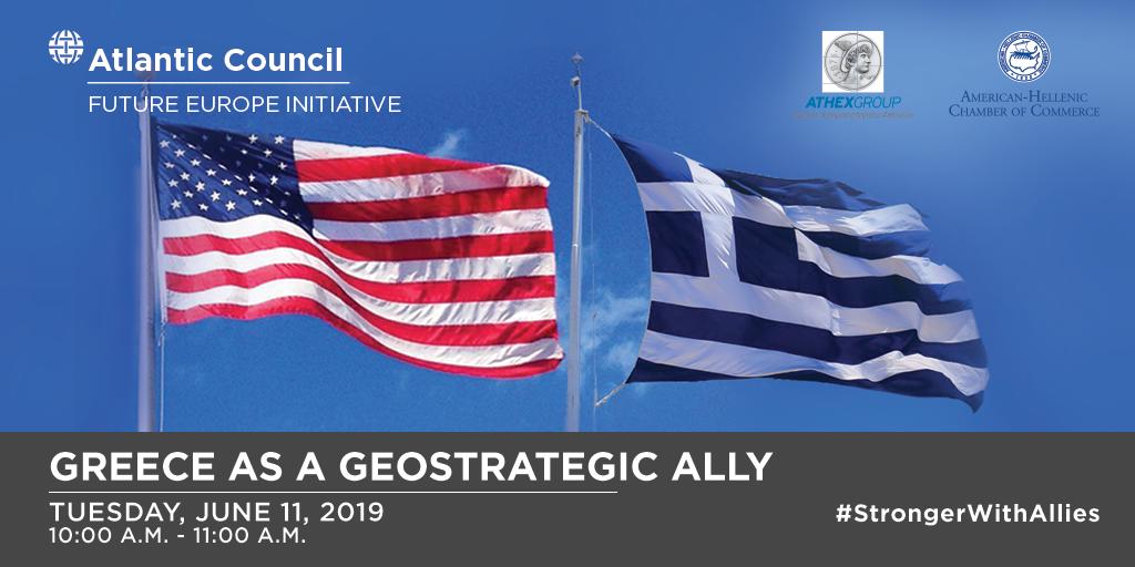 Κατόπιν πρωτοβουλίας του Συμβουλίου του Ατλαντικού για τη Μελλοντική Ευρώπη και του Ελληνο-Αμερικανικού Εμπορικού Επιμελητηρίου σε συνεργασία με την Ομάδα Athens Exchange θα πραγματοποιηθεί συνέδριο με θέμα «Η Ελλάδα ως Γεωστρατηγικός Σύμμαχος». Η εκδήλωση θα πραγματοποιηθεί την Τρίτη 11 Ιουνίου 2019 από τις 10:00 π.μ. έως τις 11:00 π.μ. στα κεντρικά του Ατλαντικού Συμβουλίου στην πρωτεύουσα των Ηνωμένων Πολιτειών Ουάσιγκτον.