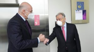 Κατά τη συνάντηση με τον γγ του ΟΗΕ, ο Νίκος Δένδιας επανέλαβε ότι η Ελλάδα επιθυμεί την επανέναρξη των διαπραγματεύσεων για την επίλυση του Κυπριακού, εντός του γνωστού πλαισίου, και υπογράμμισε ότι η χώρα μας θα καταβάλει κάθε προσπάθεια για την επίτευξη του στόχου αυτού, αναφέρουν διπλωματικές πηγές. Εξέφρασε επίσης, όπως σημειώνουν, τον προβληματισμό του για την επίτευξη της προοπτικής αυτής, δεδομένης της στάσης τόσο της τουρκικής πλευράς και της τουρκο-κυπριακής κοινότητας. Διαβεβαίωσε τον γενικό γραμματέα για την εποικοδομητική στάση της Ελλάδας, μέσα στο πλαίσιο των Αποφάσεων του Συμβουλίου Ασφαλείας του ΟΗΕ.