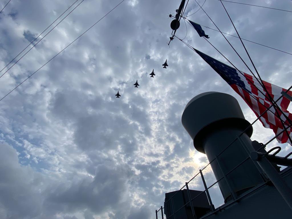 Το αμερικανικό σκάφος επέστρεφε από τη Μαύρη Θάλασσα και στο Αιγαίο το συνόδευσαν ελληνικά, η φρεγάτα “Ύδρα” όπως και πυραυλάκατος, ενώ 4αδα F-16 της ΠΑ έκανε τιμητικό πέρασμα.