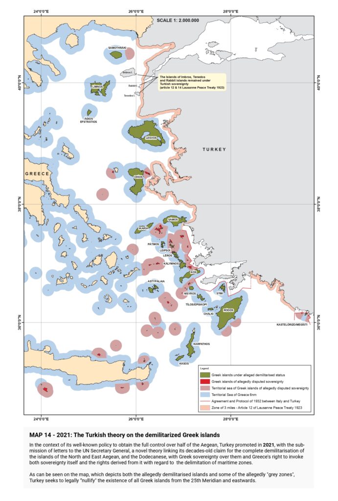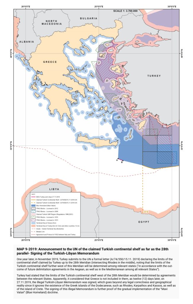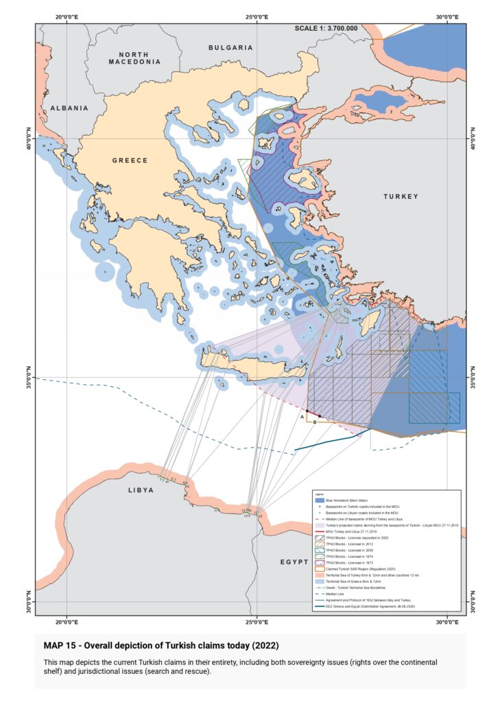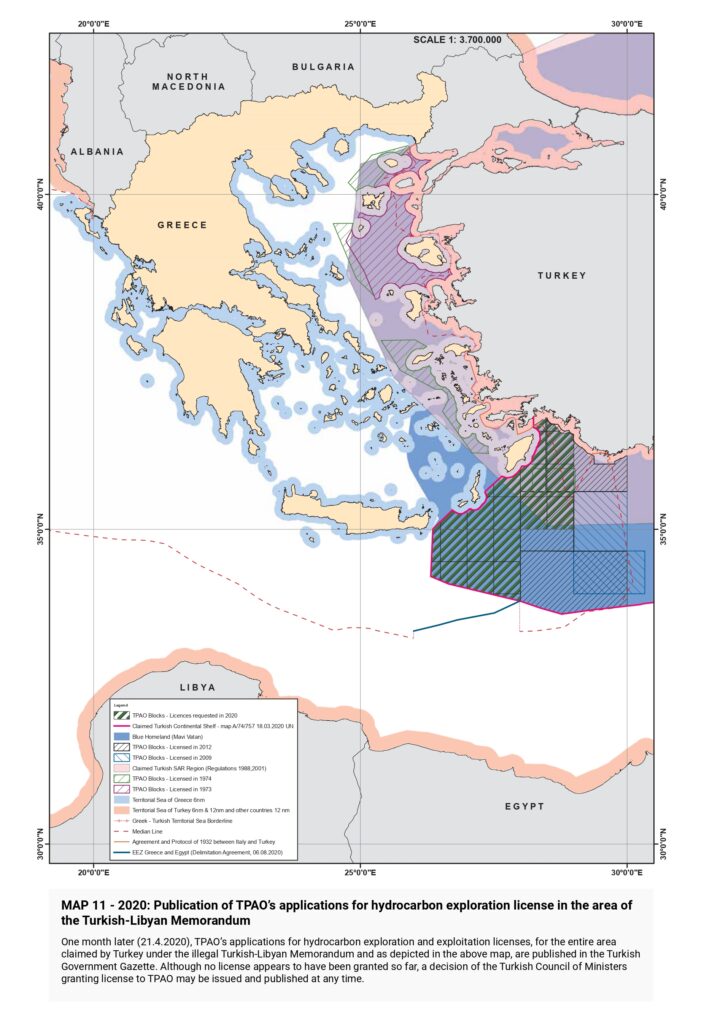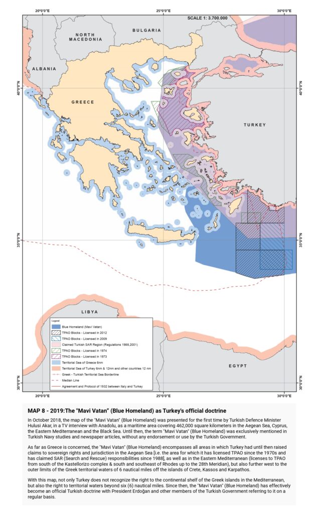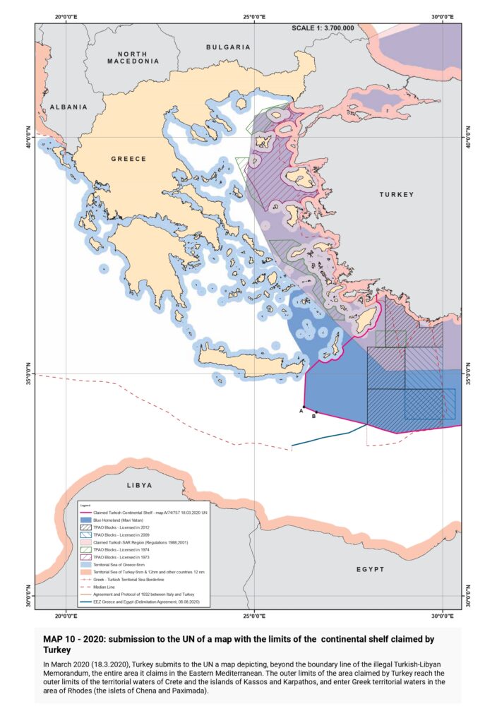 “Turkish claims are then presented, beginning with the illegal licensing of the Turkish state oil company (TPAO) for exploration of oil fields in areas of the Greek continental shelf in the North Aegean in 1973, and continuing with the attempt to usurp Greece’s responsibility for Search and Rescue services in half of the Aegean in the 1980s, the “ grey zone” theory in the 1990s, further escalation with the granting of new licenses in the Eastern Mediterranean, the endorsement of the “ Blue Homeland” as an official doctrine, the “ Turkish-Libyan Memorandum”, reaching as far as the Turkish theory of the demilitarization status of the Aegean islands.