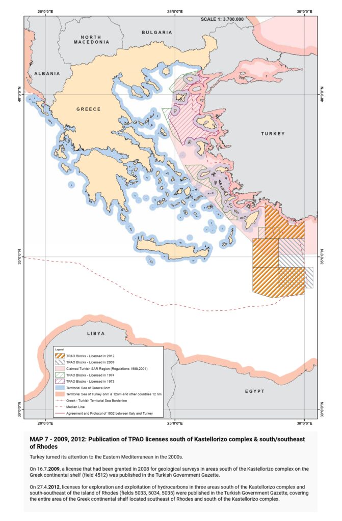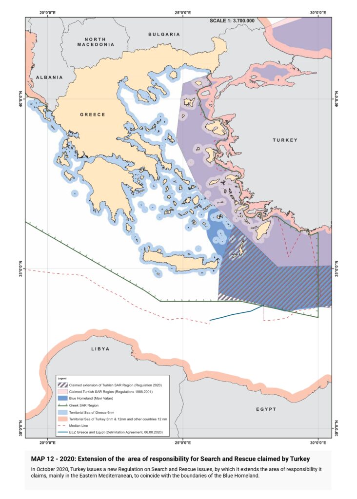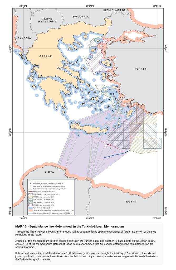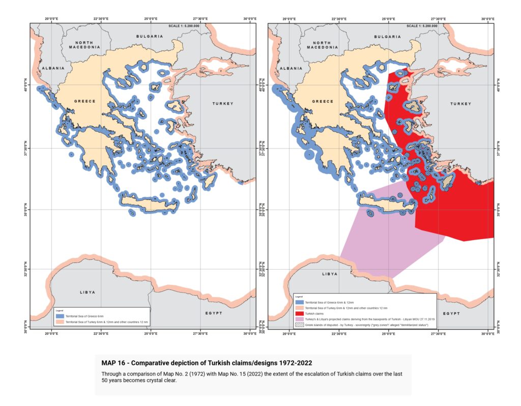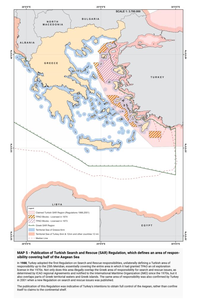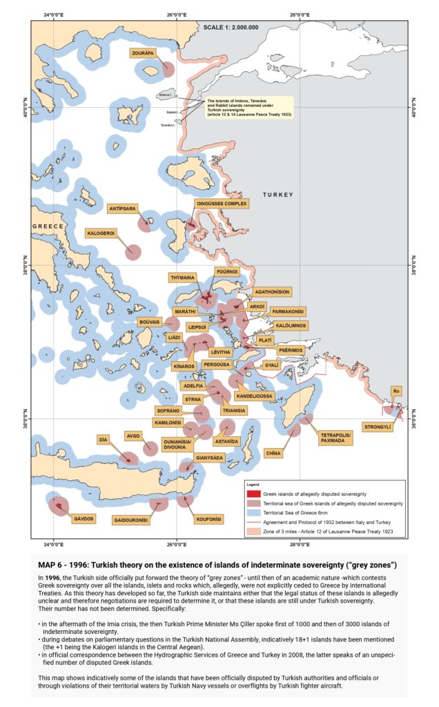 “Turkish claims are then presented, beginning with the illegal licensing of the Turkish state oil company (TPAO) for exploration of oil fields in areas of the Greek continental shelf in the North Aegean in 1973, and continuing with the attempt to usurp Greece’s responsibility for Search and Rescue services in half of the Aegean in the 1980s, the “ grey zone” theory in the 1990s, further escalation with the granting of new licenses in the Eastern Mediterranean, the endorsement of the “ Blue Homeland” as an official doctrine, the “ Turkish-Libyan Memorandum”, reaching as far as the Turkish theory of the demilitarization status of the Aegean islands.