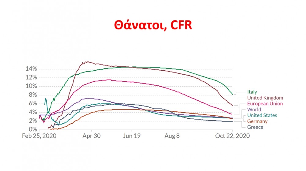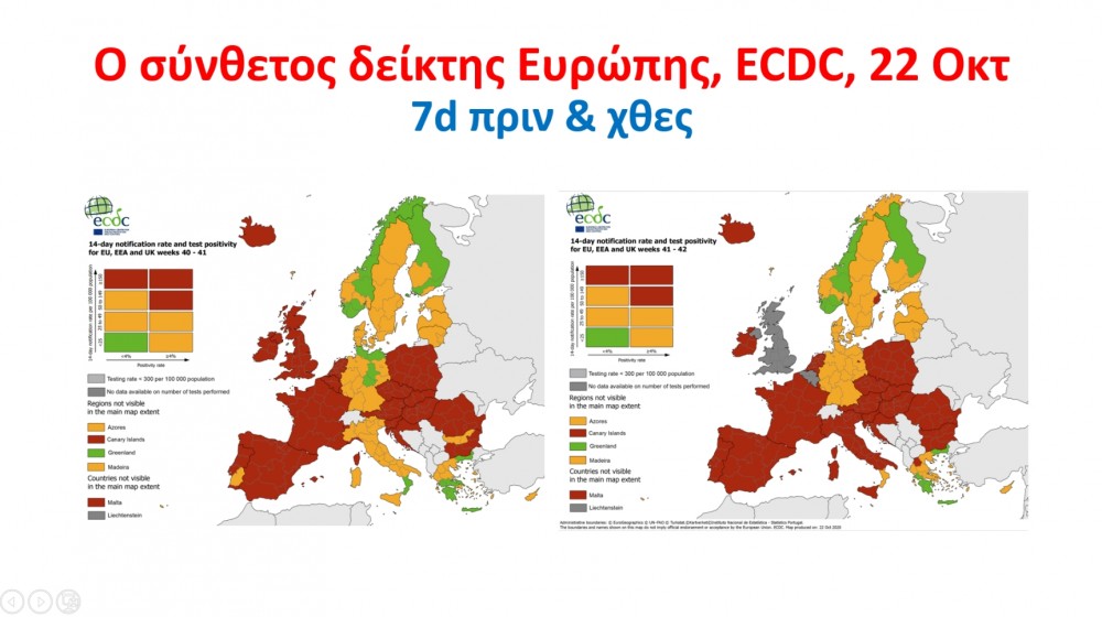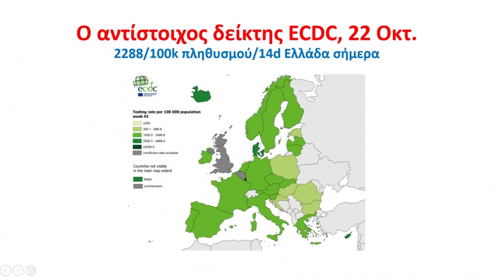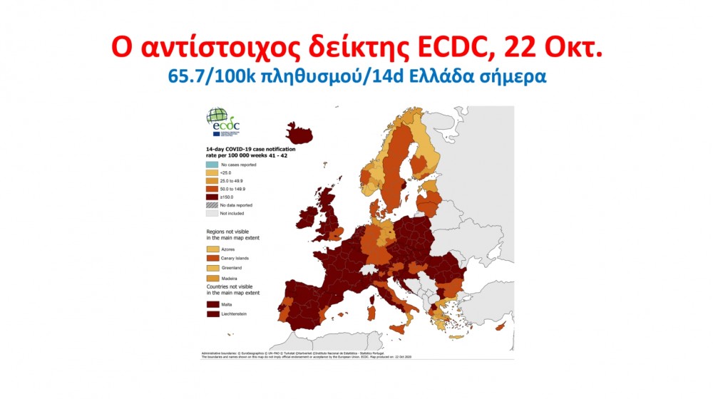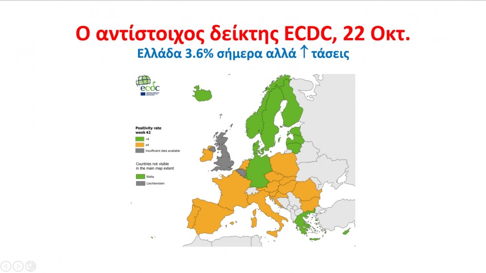 Ο κ.Μητσοτάκης αναφέρθηκε στην πανδημία και έδειξε διαγράμματα του ECDC που αποτυπώνουν την εικόνα ως προς τον αριθμό των κρουσμάτων όπου η Ελλάδα, μαζί με τις σκανδιναβικές χώρες, είναι οι καλύτερες χώρες στην Ευρωπαϊκή Ένωση ως προς τον αριθμό των κρουσμάτων. Ένα άλλο διάγραμμα με τον αριθμό τεστ ανά 100.000 πληθυσμού όπου η Ελλάδα είναι στον ευρωπαϊκό μέσο μαζί με τις καλύτερες ευρωπαϊκές χώρες. Και τέλος έδειξε διάγραμμα με τον δείκτης θετικότητας, που δείχνει το ποσοστό θετικών στα τεστ που γίνονται. Η Ελλάδα είναι στο 3,6 «πράσινη», μαζί με τη Γερμανία, τις Βαλτικές χώρες και τις Σκανδιναβικές χώρες, και οι υπόλοιπες ευρωπαϊκές χώρες όλες στο «πορτοκαλί» όπως είπε ο κ.Μητσοτάκης.