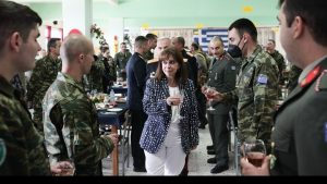 Η κ. Σακελλαροπούλου αντάλλαξε ευχές και τσούγκρισε κόκκινα αυγά με αξιωματικούς, υπαξιωματικούς και οπλίτες. Τους είπε πως είναι έθιμο η επίσκεψη της Προέδρου της Δημοκρατίας σε στρατιωτική μονάδα την Κυριακή του Πάσχα και ευχήθηκε “χρόνια πολλά” στους ίδιους και τις οικογένειες τους.