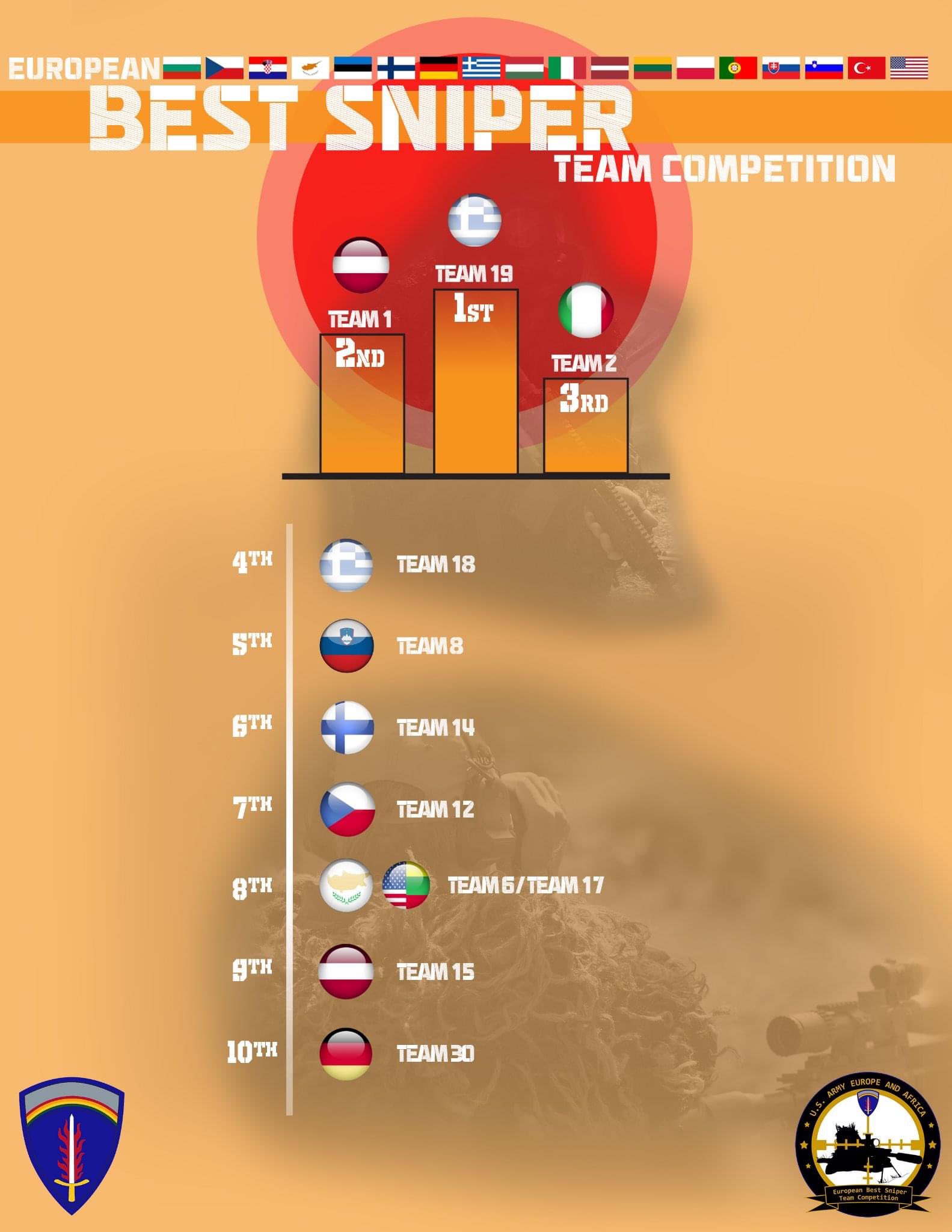 Συνολικά 36 στρατιωτικές ομάδες από 18 χώρες-μέλη ΝΑΤΟ και συνεργαζόμενες, συναγωνίστηκαν στο κέντρο εκπαίδευσης Hohenfels στην Γερμανία, για το φετινό διαγωνισμό European Best Sniper. Η διαδικασία κράτησε 8 μέρες και οργανώνεται από τη Διοίκηση Εκπαίδευσης της 7ης Αμερικανικής Στρατιάς. Οι ομάδες διαγωνίστηκαν σε: