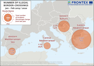 Τα ελληνοτουρκικά σύνορα συνεχίζουν να αποτελούν το πιο δημοφιλές πέρασμα εισόδου παράτυπων μεταναστών και προσφύγων στην Ευρωπαϊκή Ένωση (Ε.Ε.) το πρώτο δίμηνο του 2020.